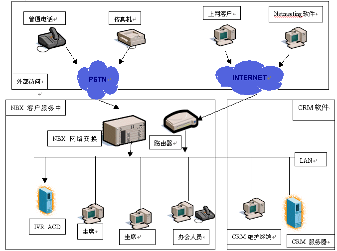 NBX客戶服務(wù)中心是基于3Com公司的NBX網(wǎng)絡(luò)電話交換機(jī)平臺構(gòu)筑的新一代呼叫中心,首先它擴(kuò)大了服務(wù)方式,客戶不但可以通過電話得到服務(wù),還可以在上網(wǎng)訪問企業(yè)主頁的同時(shí)使用耳機(jī)、麥克風(fēng)直接與服務(wù)代理人員(AGENT)語音通話,一邊瀏覽網(wǎng)頁,一邊交談,增加交流的信息輔助量。還可以通過電子郵件、傳真等方式完成與企業(yè)信息交流,其次NBX客戶服務(wù)中心內(nèi)部數(shù)據(jù)、語音兩網(wǎng)合一的布線結(jié)構(gòu),不但提高了呼叫中心的穩(wěn)定性,而且使客戶數(shù)據(jù)能與電話語音同步協(xié)調(diào),完成具有針對性的一對一的客戶服務(wù)。
