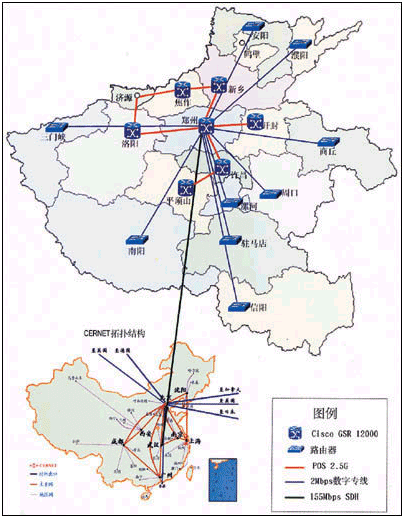 河南省教育科研計(jì)算機(jī)網(wǎng)(HERNET)作為中國(guó)教育科研計(jì)算機(jī)網(wǎng)絡(luò)(CERNET)在河南的省級(jí)網(wǎng)絡(luò),提供河南省的教育與科研機(jī)構(gòu)的Internet接入。在CERNET業(yè)已發(fā)展成為中國(guó)第二大互聯(lián)網(wǎng)的今天,各省教研網(wǎng)的建設(shè)變得尤為重要,河南省在2001年啟動(dòng)“教育信息化年”規(guī)劃后,多方合作,采用思科系統(tǒng)(中國(guó))網(wǎng)絡(luò)技術(shù)有限公司的高端網(wǎng)絡(luò)設(shè)備,將原來(lái)骨干帶寬僅為2M的教育科研網(wǎng)升級(jí)到2.5G,順利實(shí)現(xiàn)了教育科研網(wǎng)絡(luò)應(yīng)用的飛躍性進(jìn)步,并且真正實(shí)現(xiàn)了“三網(wǎng)合一”。