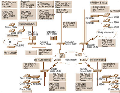 3524交換機(jī),它們能支持330多部思科IP 電話(huà)。各城市間的站點(diǎn)通過(guò)幀中繼WAN互相連接。在夏洛特斯維爾,3個(gè)基本速率接口(PRI)線(xiàn)路提供與公眾交換電話(huà)網(wǎng)(PSTN)的連接。由于SNL