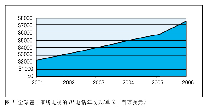有線電視運(yùn)營(yíng)商在尋找使用有線電視基礎(chǔ)網(wǎng)絡(luò)HFC的新服務(wù),創(chuàng)造新的經(jīng)濟(jì)增長(zhǎng)點(diǎn),提供數(shù)據(jù)、語(yǔ)音、圖像綜合的服務(wù);谟芯電視系統(tǒng)的IP電話將是第一個(gè)最有可能推出的新服務(wù)。2002年InStat/MDR的分析報(bào)告說2006年基于有線電視的IP電話網(wǎng)將達(dá)到US$75億的年收入,如圖1所示。