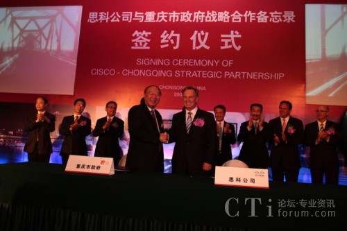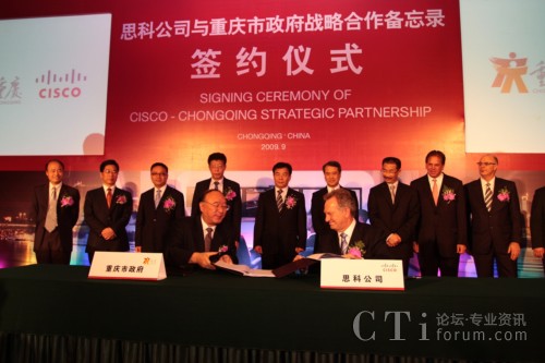 CTI論壇(ctiforum)9月14日消息:2009年9月11日,重慶市人民政府與思科正式簽訂合作備忘錄,雙方將結為戰(zhàn)略合作伙伴關系,就通信產品制造、“智能+互聯城市”試點示范、綠色技術研發(fā)與創(chuàng)新及風險投資等多方面展開深入合作。此次合作將進一步加快重慶市產業(yè)結構和產品結構調整,促進內陸開放城市建設;加快發(fā)展重慶通信產品產業(yè)集群,把重慶建設成為西部重要的現代通信產品制造基地;推動以信息產業(yè)為主體的重慶高新技術產業(yè)發(fā)展以及本土創(chuàng)新和可持續(xù)性能力的提供,更高效便捷地加快本土企業(yè)的國際化進程;整合多方國際資源,以推進重慶在中國率先成為“智能+互聯城市”,讓市民享受更多的工作和生活便利及實惠。作為思科在華創(chuàng)新及可持續(xù)發(fā)展戰(zhàn)略實施的又一里程碑,此次合作不僅是思科“智能+互聯城市”計劃在中國與當地政府的首度合作項目,也是思科在“協作型創(chuàng)新模式”指導下激勵本土創(chuàng)新的全新實踐。