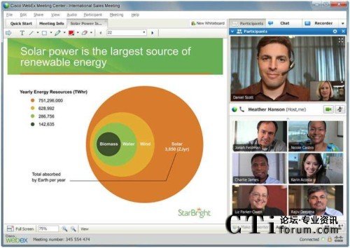 隨著支持高質(zhì)量視頻的思科WebEx™ Meeting Center的推出,與會(huì)者將能夠在全屏視頻模式下非常清晰的看到其他與會(huì)人員,從而使網(wǎng)絡(luò)會(huì)議變成一個(gè)虛擬視頻會(huì)議室。除了能夠通過高清晰度的全屏顯示看到發(fā)言者外,用戶還能同時(shí)共享桌面,并通過思科的 WebEx One Touch輕松接入思科網(wǎng)真會(huì)議。思科WebEx還提供ActivePresence功能,可沿屏幕底部以條狀顯示所有與會(huì)者。當(dāng)前的發(fā)言者以全屏顯示,并保持與參會(huì)者之間的視頻交互。借助語音激活轉(zhuǎn)換功能,當(dāng)另一個(gè)與會(huì)者開始發(fā)言時(shí),他將被轉(zhuǎn)為全屏顯示狀態(tài)。思科網(wǎng)真終端也支持ActivePresence功能。
