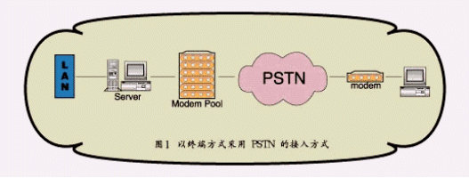 由于上述原因,遠(yuǎn)程訪(fǎng)問(wèn)技術(shù)長(zhǎng)期以來(lái)一直使用一種最為普通、隨處可得的傳輸媒介——PSTN(公用電話(huà)網(wǎng))。利用Modem模擬撥號(hào)技術(shù)來(lái)實(shí)現(xiàn)遠(yuǎn)程連接。利用PSTN進(jìn)行遠(yuǎn)程接入,用戶(hù)只要利用一條電話(huà)線(xiàn)和普通的Modem(調(diào)制解調(diào)器),對(duì)于用戶(hù)來(lái)說(shuō),一次性投入很小。當(dāng)然如果用戶(hù)想同時(shí)獲得數(shù)據(jù)服務(wù)和模擬的電話(huà)傳真服務(wù),就不得不再申請(qǐng)一個(gè)號(hào)碼,因?yàn)樵谶@種通訊方式下,數(shù)據(jù)和模擬通訊均要求獨(dú)占一個(gè)信道。而企業(yè)需在局域網(wǎng)邊緣設(shè)置遠(yuǎn)程訪(fǎng)問(wèn)接入設(shè)備并配備一定數(shù)量的語(yǔ)音中繼線(xiàn)路供遠(yuǎn)程訪(fǎng)問(wèn)用戶(hù)撥入。如下圖所示: