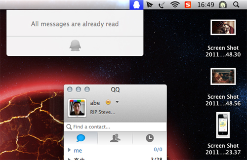 蘋果產品蘋果上的QQ客戶端QQ for Mac剛剛發(fā)布了最新版客戶端,主要增加了三個功能:語音聊天、通知欄消息提示、以及多文件傳輸。