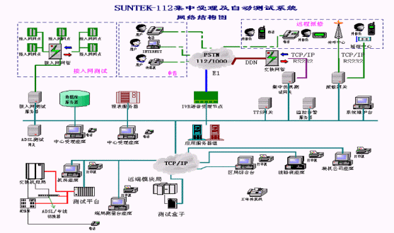 系統(tǒng)在設(shè)計(jì)時(shí)采用集中受理、分布測(cè)量的結(jié)構(gòu)化、模塊化設(shè)計(jì):受理中心進(jìn)行112的集中受理和業(yè)務(wù)處理,端局完成相應(yīng)用戶線的測(cè)試功能,所有測(cè)試數(shù)據(jù)等均送至受理中心。系統(tǒng)測(cè)試準(zhǔn)確、任務(wù)分擔(dān)、負(fù)荷均衡,處理速度快,性能可靠。系統(tǒng)的受理模塊和測(cè)試模塊相互協(xié)調(diào)又各自獨(dú)立,使二者可以統(tǒng)一地作為SUNTEKTM-112集中受理及自動(dòng)測(cè)試系統(tǒng),又能各自作為子系統(tǒng)與其它廠家(112系統(tǒng)、97系統(tǒng)、1000號(hào)等)的產(chǎn)品結(jié)合起來(lái)為112系統(tǒng)服務(wù)。系統(tǒng)網(wǎng)絡(luò)結(jié)構(gòu)圖如下所示: