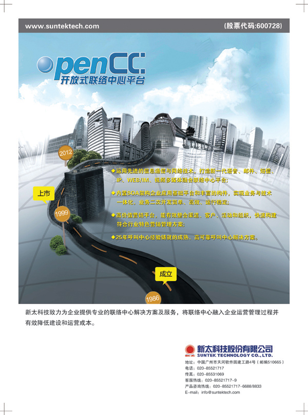 目前,新太科技的業(yè)務集中在現(xiàn)代信息服務業(yè)的三個主要領域發(fā)展,包括電信增值領域、呼叫中心領域和監(jiān)控安防領域、IT服務領域(包括電信平臺維保業(yè)務、云計算產(chǎn)品集成服務、軟件外包及一站式供應鏈管理服務),并在過去的兩年中得到了全面提升和快速發(fā)展。近期承接了一系列國家級電信增值業(yè)務平臺項目、廣州亞運會工程項目、廣州市及番禺區(qū)平安城市視頻監(jiān)控與安防系統(tǒng)項目。