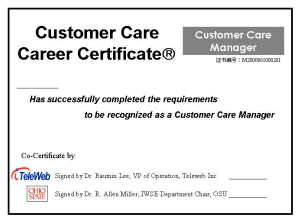 學(xué)員在經(jīng)過完整的課程培訓(xùn)之后,經(jīng)考試合格,可以獲得由美國俄亥俄州立大學(xué)與太維資訊有限公司聯(lián)合頒發(fā)的的專業(yè)培訓(xùn)證書?蛻舴⻊(wù)中心認(rèn)證的目的有兩個:首先,對于已經(jīng)在客服中心從業(yè)的人員,太維公司的培訓(xùn)可以提供一個提升他們工作能力的機會,通過培訓(xùn)后不同層次的專業(yè)培訓(xùn)認(rèn)證,太維公司以行業(yè)的標(biāo)準(zhǔn)要求對他們的提升加以證明,以加強他們在行業(yè)中的競爭能力。其次,對于有志致力于在客戶服務(wù)行業(yè)從業(yè)的人事,太維公司廣泛深入、滿足各種需求的專門技術(shù)培訓(xùn)與相應(yīng)的不同層次的認(rèn)證,為他們進入該行業(yè)提供一個標(biāo)準(zhǔn)的素質(zhì)證明,以使他們能夠順利勝任客戶服務(wù)中心的各種主要的工作職位。