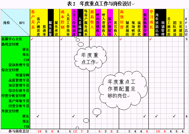 在這里,我們先以崗位設計來舉例。經(jīng)常有呼叫中心主管把每個崗位的職責都設計的非常詳細,包括了每天來做什么,說什么,錄入什么,甚至是打掃某區(qū)域衛(wèi)生之類。但是,我看遍了每一條,也沒找到這個崗位應該對什么業(yè)績"負責任",該對哪些工作做出貢獻。此處建議各位把效益評價體系、年度重點工作與崗位設計結(jié)合起來。如表2所示,我們可以把效益評價體系作為KPI放在橫坐標中,而崗位設置則是縱坐標。每個崗位對應的行中,可以勾畫其應負責或者做出主要貢獻的項目。這些項目不能超過6個,因為太多的項目會使得這個崗位無所適從,最終的結(jié)果是哪個也沒做好。當你勾畫完成之后,請計算每列的"對勾"數(shù)目,看看你本年度的重點工作是不是有較多崗位負責呢?