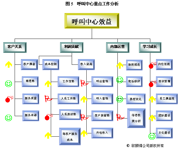 根據(jù)年度重點工作及目標,我們就可以設計關(guān)鍵措施來使其實現(xiàn)。通常一項關(guān)鍵措施可以有助于幾個目標的達成。如建立培訓體系,可以使得在崗培訓、上崗培訓、多技能訓練以及崗位技能達標率有所提升,而體現(xiàn)在業(yè)務上的效果則是服務質(zhì)量的提升、呼出營銷收入增加和客戶挽留率提高。