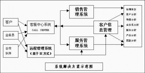 易達(dá)CRM在提供客戶信息管理、銷售管理、潛在客戶管理和服務(wù)管理基礎(chǔ)上,還充分集成了低價位的呼叫中心系統(tǒng)(Call center),以及基于IE方式的遠(yuǎn)程處理系統(tǒng),其功能框圖如下: