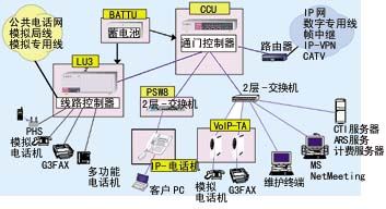 圖1顯示了一個IPstage系統(tǒng)的基本結構,IP PBX系統(tǒng)包含了通信控制器(CCU)、線路控制器(LU32)、以太網電話IP-TEL、連接普通電話的VoIP-TA適配器、后備電池,以及可直接連接PHS基站系統(tǒng)。通信控制器是IP