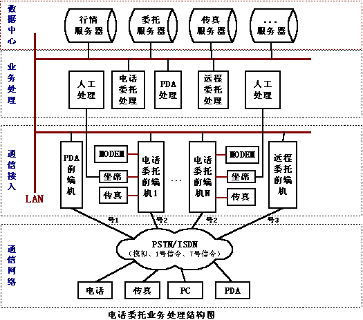 第一種方案是在證券營(yíng)業(yè)部加專(zhuān)用的前端機(jī)和處理機(jī),申請(qǐng)獨(dú)立的電話(huà)線路來(lái)處理PDA的委托,PDA和營(yíng)業(yè)部前端機(jī)采用雙向或單向的DTMF收發(fā)的方式完成通訊。根據(jù)市場(chǎng)的情況來(lái)看,這種方式不容易被證券營(yíng)業(yè)部和股民接受,證券營(yíng)業(yè)部要申請(qǐng)一定數(shù)量的電話(huà)線路,和證券電話(huà)委托的線路不能共用,增加了營(yíng)業(yè)部的費(fèi)用。由于線路的限制,股民在做委托查詢(xún)時(shí)往往出現(xiàn)線路阻塞等情況,另外DTMF通訊方式的有速度慢,信息容量有限,抗干擾性差等缺點(diǎn),股民不容易接受。目前東方潮公司的“東方獵人”的委托就是采用這種方式。
