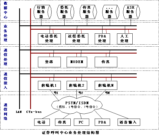 另一種方案是PDA和證券營(yíng)業(yè)部前端機(jī)(實(shí)際就是電話(huà)委托前端機(jī))采用FSK通訊方式,使用電話(huà)委托的通道來(lái)完成所有的委托查詢(xún)。這種方式的速度快,信息容量大,保密性強(qiáng),而且營(yíng)業(yè)部不需單獨(dú)申請(qǐng)電話(huà)線路,PDA和電話(huà)委托線路可動(dòng)態(tài)分配,使其電話(huà)線路得到最大限度的利用。另外,營(yíng)業(yè)部對(duì)外形象也好,只用一個(gè)號(hào)碼就可讓股民完成電話(huà)委托、PDA委托等多種委托方式,給股民帶來(lái)了方便。不過(guò)這種方式需要得到電話(huà)語(yǔ)音卡提供廠商的產(chǎn)品技術(shù)支持,語(yǔ)音卡必須同時(shí)支持標(biāo)準(zhǔn)的DTMF和FSK的方式,卡上有充足的能力來(lái)處理兩種方式,在語(yǔ)音處理卡的底層驅(qū)動(dòng)應(yīng)該將電話(huà)和PDA的委托區(qū)別開(kāi)來(lái),目前市場(chǎng)能夠完全支持這種應(yīng)用的只有深圳市東進(jìn)通訊技術(shù)股份有限公司的產(chǎn)品,東進(jìn)技術(shù)的新一代PCI系列語(yǔ)音卡數(shù)字卡和模擬卡都完全采用DSP(數(shù)字信號(hào)處理器)架構(gòu),卡上有專(zhuān)用DSP來(lái)處理DTMF和FSK的收發(fā),是目前PDA委托前端的最好選擇;這種方案還應(yīng)該得到證券電話(huà)委托系統(tǒng)的開(kāi)發(fā)商的支持,在電話(huà)委托系統(tǒng)里增加處理PDA委托的功能。目前恒基偉業(yè)的“股靈通”就是采用這種方式。