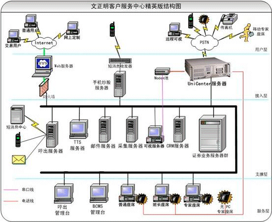 文正明的呼出系統(tǒng)可以通過電話,短信,email等各種方式主動為股民提供服務。由于ISDN的接續(xù)速度比較快,系統(tǒng)在呼出的性能上比模擬中繼和一號方式好很多。