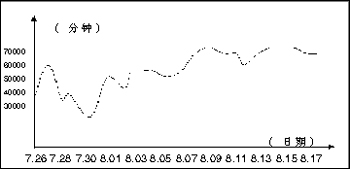 延吉通信從7月10日開始正式作宣傳,8月1日后每天時(shí)長均保持在55000分鐘以上。最新統(tǒng)計(jì)表明,自2002年7月至今,該業(yè)務(wù)已為延吉通信公司創(chuàng)造2500萬分鐘以上的市話增值。