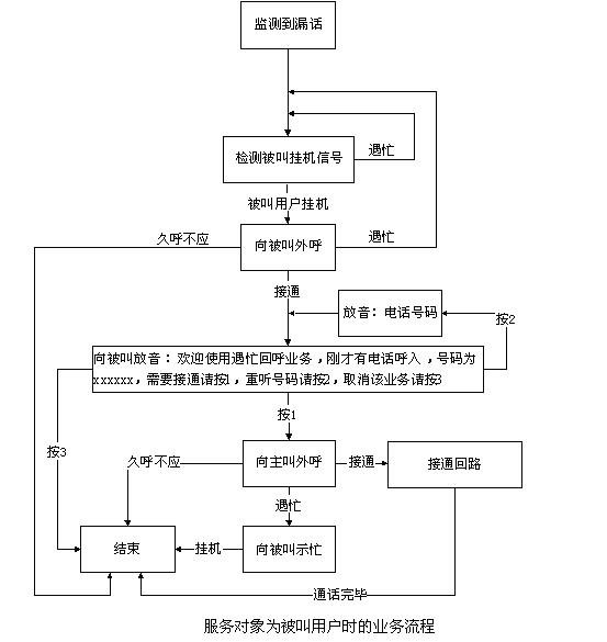 當(dāng)服務(wù)對(duì)象是被叫用戶時(shí),產(chǎn)生遇忙漏話后,東進(jìn)漏話監(jiān)測(cè)設(shè)備(DMCS)實(shí)時(shí)檢測(cè)被叫用戶的掛機(jī)信號(hào),如果被叫掛機(jī),則先向被叫外呼,呼出接通后,語(yǔ)音提示“歡迎使用遇忙回呼業(yè)務(wù),剛才有電話呼入,號(hào)碼為xxxxxx,需要接通請(qǐng)按1,重聽(tīng)號(hào)碼請(qǐng)按2,取消該業(yè)務(wù)請(qǐng)按3”,如按1,系統(tǒng)向原主叫外呼(亦稱回呼),回呼成功(ACM)后,建立話音回路,進(jìn)一步接續(xù);如回呼原主叫時(shí)遇忙(SLB、STB等),則回呼失敗,向被叫用戶示忙。