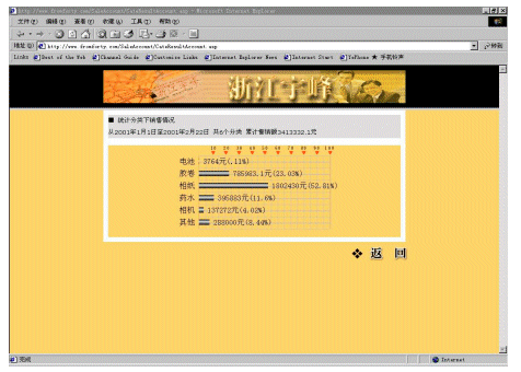宇峰公司(www.fromforty.com)是柯達(dá)(中國)有限公司在中國華東地區(qū)的總代理,負(fù)責(zé)管理華東地區(qū)近600個分銷商和連鎖店。公司非常重視信息化建設(shè),添設(shè)了大量的計算機(jī),建立起初步的管理系統(tǒng)。但是直到2000年還是依靠E-mail傳遞大量的Excel表格獲取需要的產(chǎn)品銷售和庫存的信息。這些表格對各級分銷商查詢和統(tǒng)計數(shù)據(jù)來說非常麻煩,因為每周要處理幾百個訂購單。整個處理過程非常緩慢,并且成本很高,也容易造成各種的數(shù)據(jù)錯誤。而公司內(nèi)部對業(yè)務(wù)人員銷售情況的統(tǒng)計,也頗為麻煩,因為下級分銷商上報上來的數(shù)據(jù)準(zhǔn)確性差,并且不夠及時。處理這些表格對宇峰公司和分銷商以及連鎖店而言都是效率很低的,并且常常令人茫然不知所措。