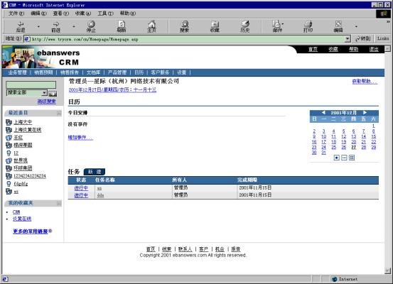 星際(杭州)網(wǎng)絡(luò)技術(shù)有限公司(www.ebanswers.com)研發(fā)的Ebanswers eCRM是中國第一套基于新一代網(wǎng)絡(luò)標(biāo)準(zhǔn)語言――XML的客戶關(guān)系管理系統(tǒng),整個(gè)系統(tǒng)提供了完善的企業(yè)級客戶關(guān)系全面解決方案,包含可無縫整合又可獨(dú)立運(yùn)行的三個(gè)功能組件:銷售,營銷,服務(wù)流程自動(dòng)化軟件系統(tǒng);客戶溝通集成信息化方案;深層商業(yè)智能分析。