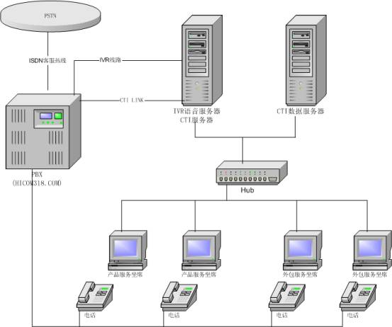 Siemens Hicom318.com交換機(jī):接入ISDN中繼線,設(shè)置人工座席分機(jī),為CTI,IVR語(yǔ)音服務(wù)器提供16路IVR端口和CTI