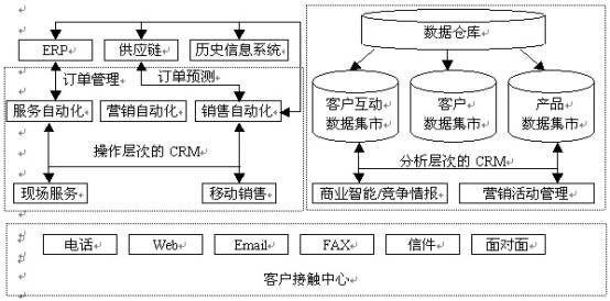 正如圖1所示,現(xiàn)在一般認(rèn)為,目前的CRM產(chǎn)品分為這樣基本的三類:分析型CRM(圖中的分析層次的CRM)、運(yùn)營型CRM(圖中的操作層次的CRM)和交互型CRM(圖中的客戶接觸中心)。交互型CRM主要在于建立一個(gè)企業(yè)與用戶的交互、溝通渠道,如電話、傳真、Web、Email、短消息、面對面接觸;運(yùn)營型CRM主要在于運(yùn)行企業(yè)的市場營銷、銷售和服務(wù)的自動(dòng)化應(yīng)用,記錄客戶的基本信息和互動(dòng)信息;而分析型CRM則在于分析完整客戶信息(包括靜態(tài)的客戶基本信息和動(dòng)態(tài)的客戶交互信息),掌握和預(yù)測客戶的個(gè)性化需求,并開展相應(yīng)的營銷和銷售活動(dòng),提供相應(yīng)的服務(wù)和支持。