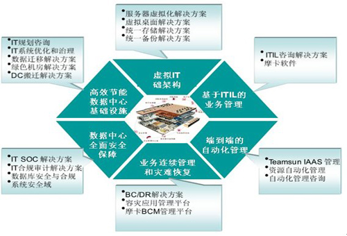 圍繞云計(jì)算數(shù)據(jù)中心的建設(shè),華勝天成共開發(fā)了多個(gè)解決方案,且每個(gè)解決方案均有專業(yè)的售前支持團(tuán)隊(duì)和售后實(shí)施團(tuán)隊(duì),這些解決方案不是分散而無關(guān)的,而是針對(duì)用戶的不同情況,在各方面均給予綜合考慮,以最優(yōu)的設(shè)計(jì)方案來滿足用戶的需要,并兼顧另外方面的后繼需求。