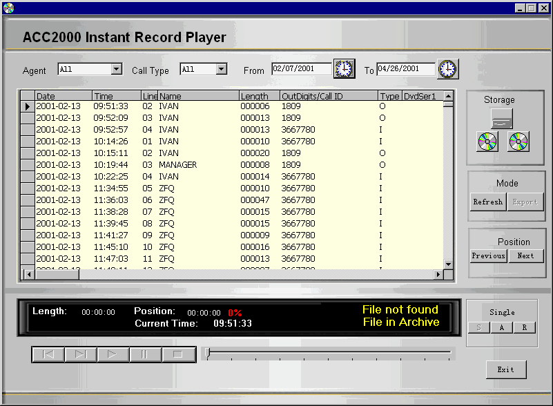 ACC2000 多媒體溝通中心采用最先進(jìn)的海量存儲設(shè)備DVD RAM構(gòu)建實時多通道語音錄制、備份系統(tǒng)��ACC2000 DVD Record Backup。這個系統(tǒng)可以根據(jù)管理員設(shè)定的錄音對象,對符合錄音條件的通話自動進(jìn)行錄音!