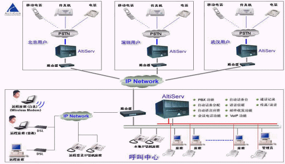 AltiCenter 將奧迪堅(jiān)所倡導(dǎo)的基于IP分布式呼叫中心技術(shù)完美轉(zhuǎn)化為產(chǎn)品,為用戶輕松構(gòu)建基于IP的分布式呼叫中心系統(tǒng)。該呼叫中心不僅提供語音電話,還能提供包括音頻視頻在內(nèi)的多媒體通信;不僅能支持傳統(tǒng)的電話終端,還能支持來自Internet的語音、數(shù)據(jù)信息等多種交互方式;不僅提供了完整的本地座席功能,還提供遠(yuǎn)程IP座席,遠(yuǎn)程IP專家座席,并提供高度統(tǒng)一實(shí)用的呼叫中心管理體系。AltiCenter在設(shè)計(jì)之初就采用IP內(nèi)核的一體化設(shè)計(jì),不需要任何語音網(wǎng)關(guān)設(shè)備,就可以在網(wǎng)絡(luò)上構(gòu)建一個語音和數(shù)據(jù)的統(tǒng)一平臺,無論在世界的哪個角落,遠(yuǎn)程IP座席和分布的異地機(jī)構(gòu)都可以共享客戶的所有資源(語音、數(shù)據(jù)、座席),由于采用了先進(jìn)的VoIP技術(shù),可以為各地的電話和Internet的客戶提供統(tǒng)一的客戶號碼和統(tǒng)一的客戶服務(wù),并極大地降低呼叫中心的運(yùn)營成本,真正幫助用戶建立一個高效的、信息共享的分布式呼叫中心系統(tǒng)。