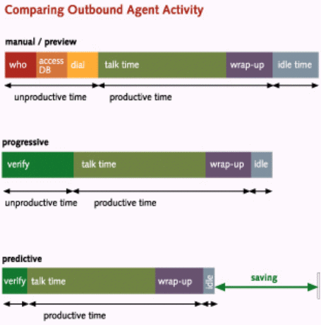 預(yù)覽撥號 在坐席代表與客戶交談之前必須要知道客戶情況時使用。預(yù)覽撥號比手工撥號效率稍高一些,因?yàn)榭蛻舻脑敿?xì)信息會呈現(xiàn)在坐席代表屏幕上并且呼叫僅在坐席代表準(zhǔn)備好時才會撥出。預(yù)覽撥號節(jié)約了撥電話號碼的"手指時間"并且能夠增加聯(lián)絡(luò)列表管理的效率。然而,總體來說坐席代表的通話時間典型地在大約每小時18到20分鐘。