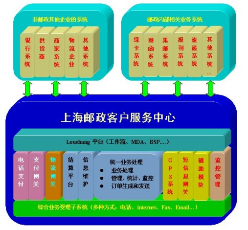 作為上海郵政客戶服務(wù)中心系統(tǒng),由綜合業(yè)務(wù)受理、統(tǒng)一業(yè)務(wù)處理、多種支付手段、統(tǒng)一物流接口以及多種輔助功能等多個子系統(tǒng)組成,在設(shè)計(jì)中必須要整體考慮其各子系統(tǒng)之間有機(jī)結(jié)合,以及與其他業(yè)務(wù)系統(tǒng)的信息處理接口。