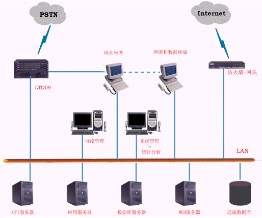 LTD4000客戶(hù)服務(wù)中心主要由LTD-09可編程智能語(yǔ)音交換機(jī)、業(yè)務(wù)代表座席、CTI服務(wù)器、數(shù)據(jù)庫(kù)服務(wù)器、WEB服務(wù)器、管理監(jiān)控工作站和網(wǎng)絡(luò)連接設(shè)備等部分組成。