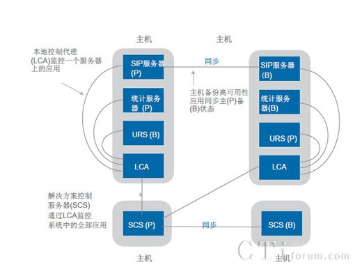 除了提供多個解決方案組件級的高可用性之外,高可用性功能也被融入到了管理框架中。圖4作為假設系統(tǒng)配置顯示了Genesys系統(tǒng)中高可用性管理的幾個重要方面。通過此類架構,解決方案控制服務器(SCS)管理著系統(tǒng)中所有Genesys組件的服務狀態(tài),包括啟動和停止組件以及管理它們的高可用性主/備狀態(tài)等。SCS與本地控制代理(LCA)的多個實例共同運行。每個物理主機上面都安裝有LCA的一個實例,用于在SCS與主機上面安裝的單個組件之間提供接口。