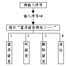 3). 若輸入的分機(jī)信箱號(hào)碼正確,此時(shí)系統(tǒng)會(huì)提示用戶"留言請(qǐng)按1,主人訪問(wèn)請(qǐng)按2",按1后即可給該信箱留言。