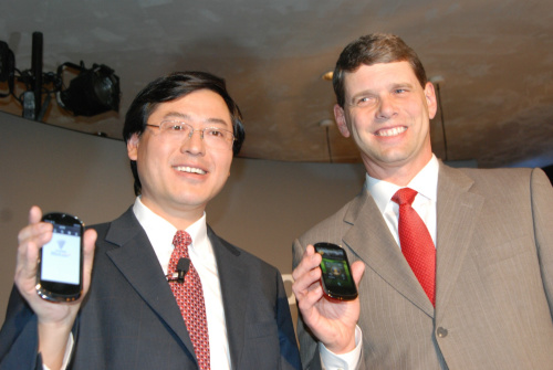 圖:聯(lián)想集團CEO楊元慶和COO Rory Read向與會者展示聯(lián)想集團首款智能手機樂phone