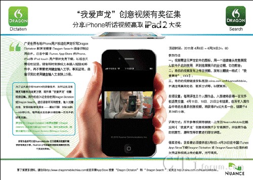 領(lǐng)獎資格:獲獎?wù)弑仨毺峁┰?月8日-4月24日期間在中國 iTunes App Store下載Dragon Dictation 或 Dragon Search應(yīng)用的相關(guān)憑證和視頻上傳的截屏,方可領(lǐng)獎。