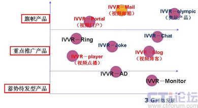 高陽IVVR(Interactive Voice and Video Response)即是基于CS域,擴展高陽原有IVR平臺的視頻承載能力,研發(fā)出的一套集Audio、Video等多媒體數據交互業(yè)務于一體的承載平臺。高陽IVVR交互式語音和視頻應答的業(yè)務應用,在寬帶應用中以視頻為業(yè)務呈現形式,以語音為服務手段,與SP進行內容合作,豐富業(yè)務內容和形式,整合多種媒體功能為用戶提供最時尚、最精彩的互動式視頻服務。主要有:“視頻點播”、“視頻郵箱”、“視頻彩鈴”、“手機家庭監(jiān)控”、“視頻博客”、“奧運產品”、“視頻門戶”等。