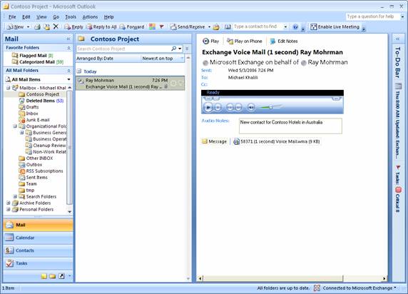 Outlook 2007,它將語音郵件作為優(yōu)先數(shù)據(jù)類型來集成。Outlook 2007 界面允許用戶連同其它數(shù)據(jù)項一起對語音郵件消息進(jìn)行排序、搜索和確定其優(yōu)先級;此外,用戶可以在他們的座機(jī)上播放語音郵件消息,并向語音郵件消息添加附注,以便連同關(guān)聯(lián)的發(fā)件人和日期信息一起對消息內(nèi)容建立索引。(請參見圖2)Outlook