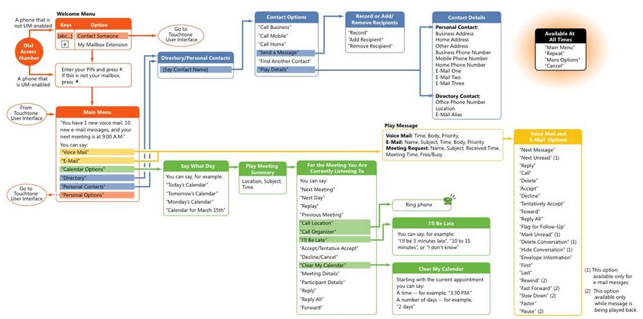 允許用戶通過電話處理他們的消息和日歷數(shù)據(jù)(包括收聽、轉(zhuǎn)發(fā)和回復(fù)電子郵件,以及發(fā)出、更新或響應(yīng)會議請求)。用戶可以標(biāo)記消息以便跟蹤、跳到下一封未讀郵件、隱藏或刪除對話,甚至查找來自特定用戶的消息,這一切全都使用語音導(dǎo)航或標(biāo)準(zhǔn)按鍵式鍵盤來完成。