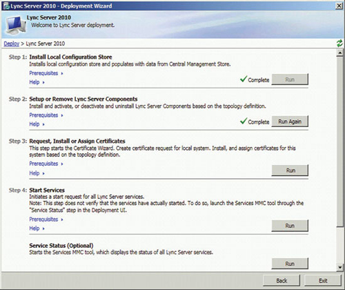 準備好基礎結(jié)構(gòu)并發(fā)布拓撲后,即可開始安裝前端服務器和服務器角色,以啟用 A/V 會議、企業(yè)語音、監(jiān)控、存檔及其他功能。準備每臺服務器從運行部署向?qū)В▍⒁妶D 3)開始,但每個服務器角色都有自己的安裝和配置要求。您可以在 TechNet 庫的“部署 Lync Server 2010 Standard Edition”部分查找更多詳細信息。