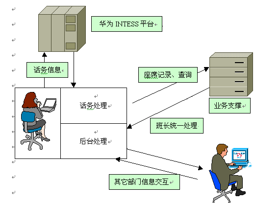 該系統(tǒng)在鐵通CRIS 平臺上運行,前端接入采用華為CC08-A型排隊機,華為INTESS平臺,集成正邦高科座席軟件。完成企業(yè)業(yè)務(wù)咨詢、投訴建議的受理、產(chǎn)品訂購、外呼調(diào)查等業(yè)務(wù),并針對各業(yè)務(wù)的特色規(guī)劃了企業(yè)的業(yè)務(wù)流程。正邦高科客戶服務(wù)系統(tǒng)的坐席軟件,和華為INTESS采用緊耦合方式將話務(wù)信息和業(yè)務(wù)信息結(jié)合在一起,便于統(tǒng)計分析,制訂客戶服務(wù)中心的運營策略。在后臺業(yè)務(wù)管理系統(tǒng)中,客戶服務(wù)系統(tǒng)設(shè)計了便于分析業(yè)務(wù)的一系列統(tǒng)計報表,使企業(yè)可以方便地對銷售過程進行跟蹤和定單派發(fā)。