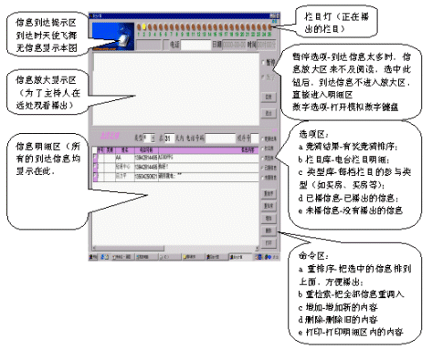 如果信息到達量過大,會導致信息放大區(qū)中的信息不斷被更新,此時,只要選中暫停選項,信息放大區(qū)的信息就不會被更新。該信息播出后,如果需要播出明細區(qū)中的內容,只要在明細區(qū)中用鼠標左鍵雙擊該信息的信息內容,該信息內容立即上升到放大區(qū)中,同時該信息發(fā)送人的姓名、性別、電話、日期、時間會同時上升到放大區(qū)上方,而且該信息內容會自動轉移到已播出信息中(這樣可以迅速明細區(qū)中的信息減少,方便主持人播出其他信息)。