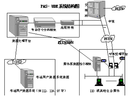 為了滿足各類社會(huì)應(yīng)急與服務(wù)呼叫系統(tǒng)對(duì)電話用戶資料的需要,同時(shí)又解決電信部門對(duì)用戶資料數(shù)據(jù)庫(kù)的保密和安全要求,我公司成功開(kāi)發(fā)了PAS-UDE(User Data Extract)電話信息回送系統(tǒng),并成為110聯(lián)網(wǎng)接口設(shè)備開(kāi)發(fā)生產(chǎn)入網(wǎng)廠商。