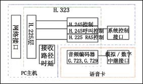 用語(yǔ)音卡來(lái)搭建IP超市的核心在于如何用語(yǔ)音卡來(lái)搭建一個(gè)VoIP的語(yǔ)音網(wǎng)關(guān)。由于增加了VoIP功能,與傳統(tǒng)的CTI集成相比較,用語(yǔ)音卡來(lái)搭建一個(gè)VoIP的語(yǔ)音網(wǎng)關(guān),更富有挑戰(zhàn)性:語(yǔ)音卡除需要實(shí)現(xiàn)原有的模擬或數(shù)字電路接口外,還需要實(shí)現(xiàn)語(yǔ)音壓縮的編解碼、語(yǔ)音在IP網(wǎng)的傳輸協(xié)議以及解決好由此而產(chǎn)生的如回聲消除、靜音抑制、去時(shí)延抖動(dòng)、QoS控制等問(wèn)題。語(yǔ)音編碼標(biāo)準(zhǔn)一般要支持G.729、G.723等,目前國(guó)內(nèi)絕大多數(shù)VoIP網(wǎng)絡(luò)采用H.323協(xié)議棧,從兼容性考慮,用語(yǔ)音卡搭建的VoIP語(yǔ)音網(wǎng)關(guān)也應(yīng)采用H.323協(xié)議。其結(jié)構(gòu)如圖1所示。