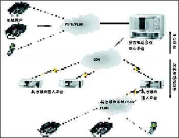 目前,根據(jù)建設(shè)思路中所提到的分期實(shí)施原則,第一期只完成本地多方電話會(huì)議中心平臺的建設(shè)。參加電話會(huì)議的各方用戶均直接通過公眾電話網(wǎng)撥入中心平臺,由中心平臺統(tǒng)一接入并組織會(huì)議資源為用戶服務(wù),結(jié)構(gòu)如圖2所示。