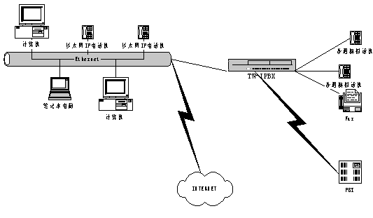該應(yīng)用示意圖具有一個(iPBX )或多個辦公場地(nIPBX - 組網(wǎng)iPBX )提供電話系統(tǒng)解決方案。該解決方案是基于IP 電話技術(shù)而構(gòu)建的Tw-IPBX “一體化概念”,同時可提供傳統(tǒng)的模擬電話概念,如模擬電話和傳真機。以下敘述了客戶機組合的單獨應(yīng)用場景,包括: