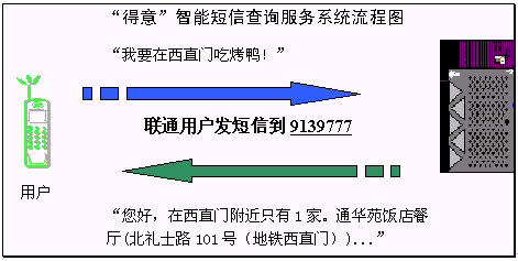 2004年4月15日和4月20日,擁有完全自主知識(shí)產(chǎn)權(quán)的語(yǔ)音與語(yǔ)言技術(shù)開(kāi)發(fā)商和技術(shù)提供商北京得意音通技術(shù)有限責(zé)任公司(得意公司),在國(guó)際上率先把中文自然語(yǔ)言理解技術(shù)應(yīng)用在中國(guó)聯(lián)通和中國(guó)移動(dòng)短信服務(wù)平臺(tái)上,結(jié)合《精品購(gòu)物指南》報(bào)社權(quán)威、全面的信息資源,開(kāi)通了北京地區(qū)餐飲領(lǐng)域智能短信查詢服務(wù)(簡(jiǎn)稱智能短信),并將進(jìn)一步支持互聯(lián)網(wǎng)平臺(tái)和WAP平臺(tái),陸續(xù)開(kāi)通更豐富和更實(shí)用的智能信息服務(wù)。