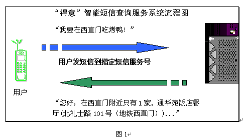 智能短信服務(wù),就是允許短信用戶在手機上直接以自然語言的形式輸入文字(而不是輸入復(fù)雜的代碼或操作繁瑣的菜單),系統(tǒng)能迅速、準確地理解用戶的意思,提供周到的信息和服務(wù)。短信服務(wù)商可根據(jù)具體應(yīng)用領(lǐng)域定制一系列全新的智能短信業(yè)務(wù),如旅游交通、餐飲娛樂、金融證券、交友網(wǎng)聚、智力競猜等受歡迎的服務(wù),將直接刺激用戶使用短信服務(wù)的興趣和頻率。得意公司提供的北京餐飲智能短信服務(wù)可以靈活、方便地引導(dǎo)用戶找到合適的餐飲信息(圖1)