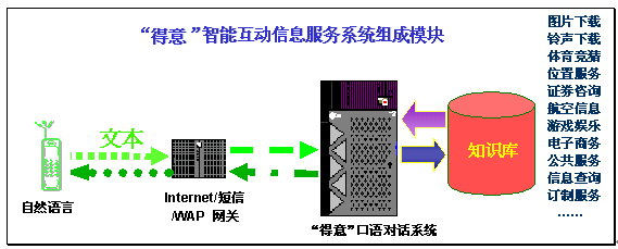 "得意"智能互動信息服務(wù),是對用戶輸入的文本進(jìn)行自動分析和理解,再從知識庫中提取用戶所需的信息,然后自動產(chǎn)生智能應(yīng)答語句,并以文本的形式通過電腦或者手機(jī)發(fā)回用戶。由于"得意"口語對話系統(tǒng)具有上下文相關(guān)理解和人機(jī)混合主導(dǎo)等強(qiáng)大功能,在指定的領(lǐng)域內(nèi),用戶可通過一次或者多次輸入(包括詞語、句子)構(gòu)成一組對話,完成復(fù)雜的信息查詢或者其他互動信息服務(wù)。