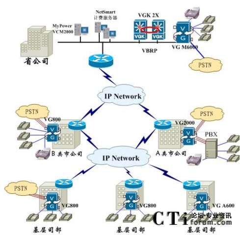 在此典型應(yīng)用中,省公司采用VG M6000,配置32FXO接入卡和E1中繼卡,實(shí)現(xiàn)大容量接入和本地PSTN落地;地市B采用VG800,配置FXO模擬接入卡和FXS模擬中繼卡,實(shí)現(xiàn)本地電話接入和PSTN落地;地市A采用VG2000,將PBX電話接入IP電話網(wǎng)絡(luò),并實(shí)現(xiàn)本地PSTN落地;基層公司根據(jù)容量需求,分別采用VG800或者VG A600實(shí)現(xiàn)電話接入。省公司配置兩臺(tái)邁普IP語(yǔ)音網(wǎng)守VGK 2X,運(yùn)行VBRP協(xié)議,實(shí)現(xiàn)網(wǎng)守?zé)醾,充分保證整個(gè)網(wǎng)絡(luò)的可靠性。