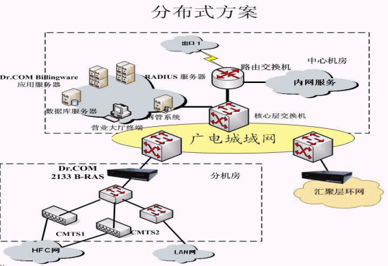 根據(jù)廣電城域網(wǎng)目前網(wǎng)絡(luò)的規(guī)模,以及以后的擴(kuò)展,采用集中接入認(rèn)證與計(jì)費(fèi),統(tǒng)一管理的方案,集中接入指:接入服務(wù)器部署在各個(gè)匯聚層的匯聚點(diǎn),即在網(wǎng)絡(luò)出口安裝寬帶接入服務(wù)器,由寬帶接入服務(wù)器對(duì)所有用戶進(jìn)行身份認(rèn)證、接入控制、實(shí)時(shí)計(jì)費(fèi)、數(shù)據(jù)采集,并將賬單和訪問(wèn)日志等傳送至綜合業(yè)務(wù)系統(tǒng)。統(tǒng)一管理指在中心機(jī)房就可以進(jìn)行全部的管理,包括:網(wǎng)絡(luò)設(shè)備管理;用戶管理;經(jīng)營(yíng)策略管理;賬務(wù)管理;安全管理;數(shù)據(jù)分析。提供完整的用戶資料分析,使用習(xí)慣分析,運(yùn)營(yíng)統(tǒng)計(jì)等詳細(xì)分析報(bào)表。