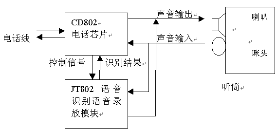 本方案主要由電話機(jī)芯片CD802加語音識別錄放模塊JT802構(gòu)成。
